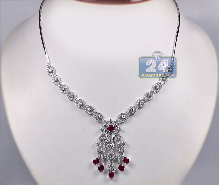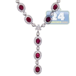 Here is women's ruby diamond necklace that any jewelry connoisseur will desire! It's expertly handcrafted in cool 18 karat white gold, and highly polished for very smooth finish. The gemstone necklace is amazed with 4.48 carats of oval-cut genuine rubies and 4.94 carats of icy white round brilliant-cut natural diamonds. Our Y shape pendant necklace measures 18 inches in length, and has width of 3/16, 9/32, 2 inches; secured be a safe box closure. This is a breathtaking and inspiring sight to behold!
