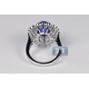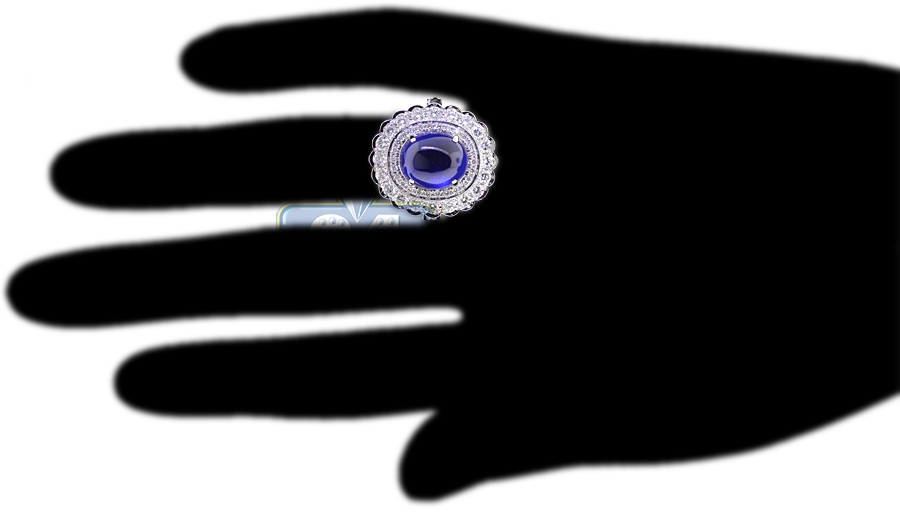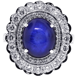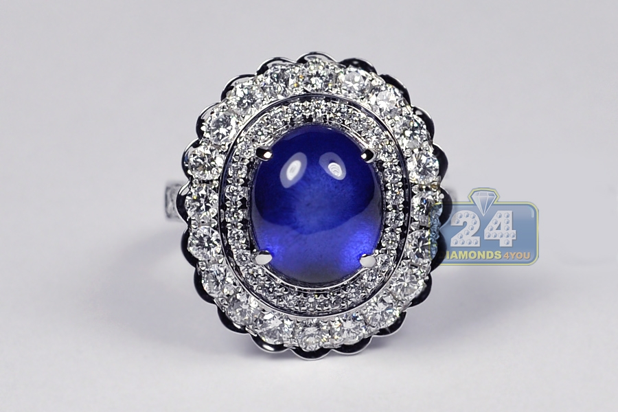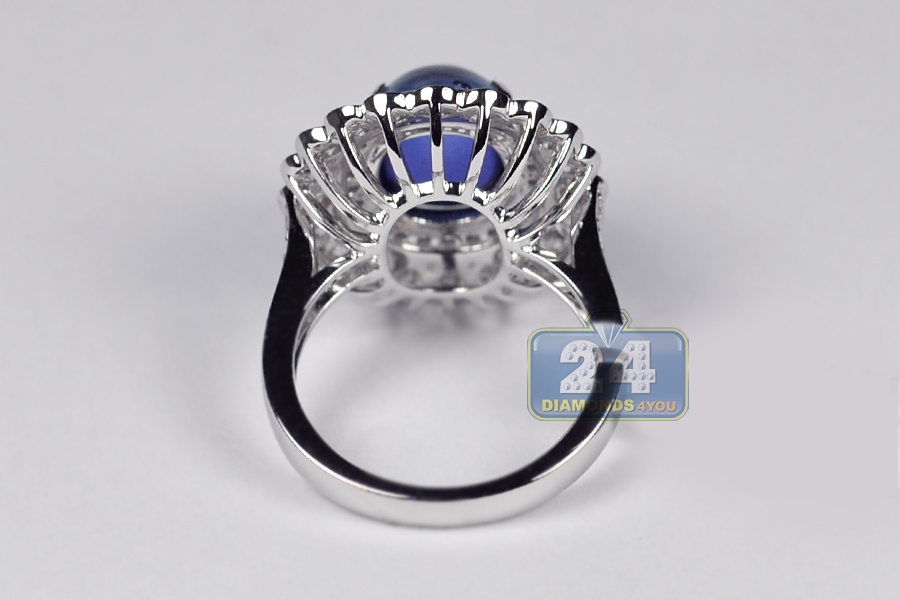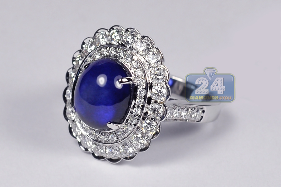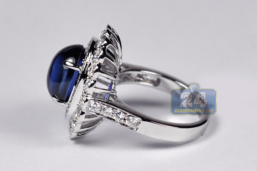 Your search will be over when you get our breathtaking diamond gemstone ring! It's artfully handmade of luxurious 18k white gold, and high-polished for shimmering smooth finish. The center features diffused blue oval cabochon-shape natural sapphire of 7.88 carats that is highlighted by 1.70 carat of icy white round brilliant-cut diamonds. The head measures 19 x 22 mm, and the shank is 3 mm. This women's ring designed in flower motif is a superb option for any special event!