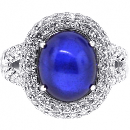 Our diamond gemstone ring is a colorful sparkler that will impress! It's artfully crafted in cool 18k white gold, and highly polished for ultra-smooth feel. Amazing focal point of this lady's ring is a diffused blue oval cabochon-cut genuine sapphire (8.42 carats). It's highlighted by icy white round brilliant-cut diamonds (1.53 carat). Size of the top is 18 x 16 mm, and the shank is 3 mm. Don't be confused when you get tons of compliments wearing this women's blue sapphire ring!