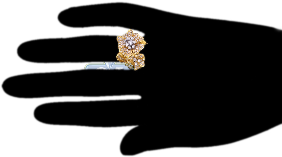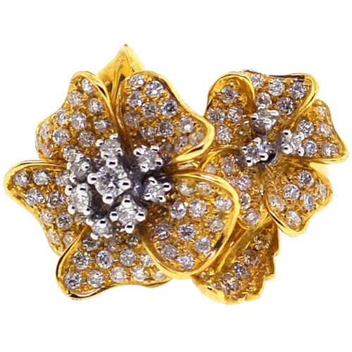 Luxurious and glamorous, our diamond flower ring has has spectacular sparkle! Professionally handmade of warm 18k yellow gold, it is accented with 1.00 carat of icy white round brilliant-cut genuine diamonds. You willl be a magnet for attention wearing this lady's diamond piece of jewelry!