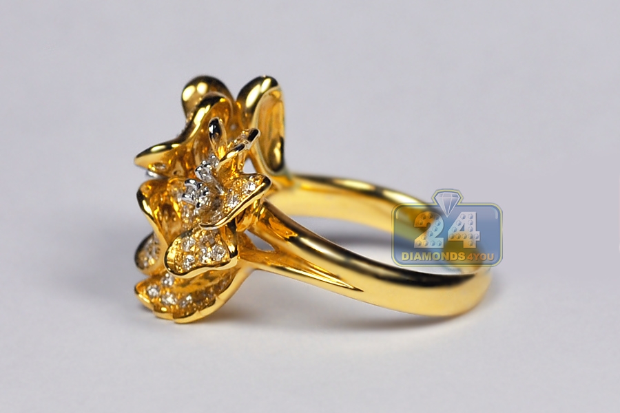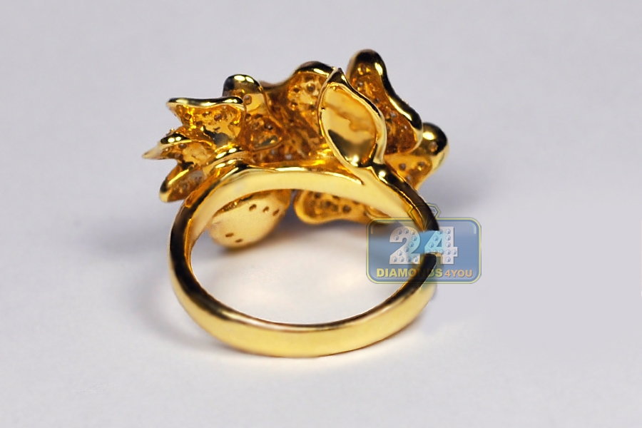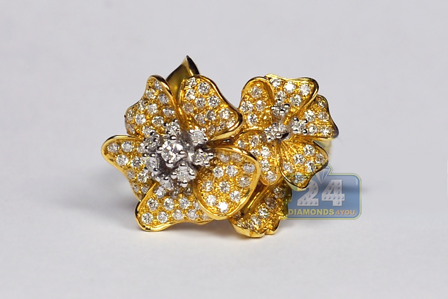 18K Yellow Gold 1.00 ct Diamond Two Flowers Womens Ring