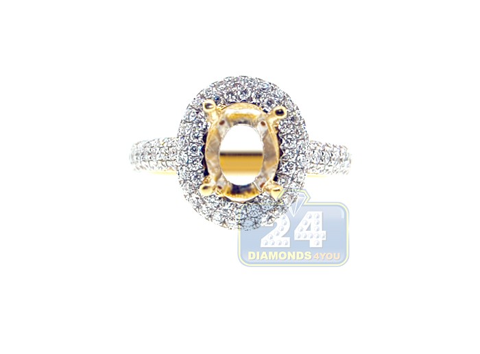 Present your beloved one this custom made 18k yellow gold engagement setting. Delicate & fancy looking shank features sparkling white round cut diamonds of the natural origin. Round shaped crown is gorgeously encrusted with glittering stones as well and fits an oval shape center stone of your choice. Promise to give her unconditional love for life with this breathtaking and beautiful engagement jewelry piece!