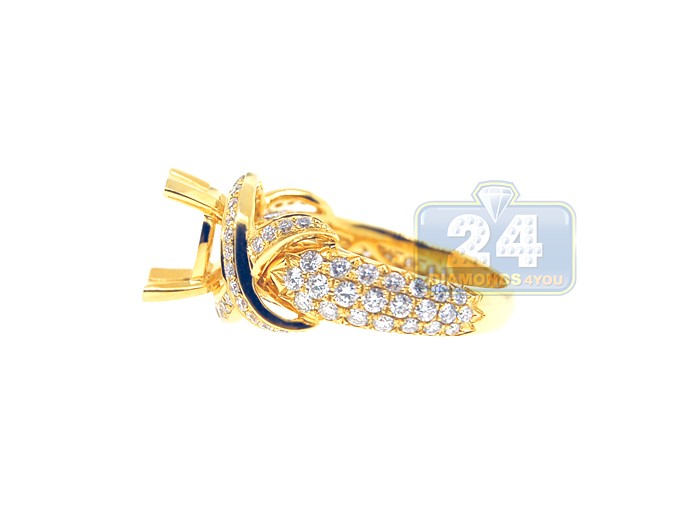 Complete this unique engagement setting with a center stone of your choice! Our vintage inspired semi mount features absolutely luxury design handmade of sunny 18k yellow gold with shiny polished finish. Two stylish intertwined strands are holding the gleaming crown that can fit a round shaped diamond or gemstone. The setting is impressively encrusted with 1.62 carat of top quality sparkling diamonds. A real treasure to own!