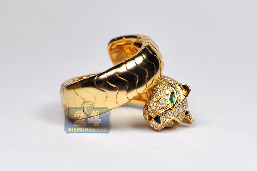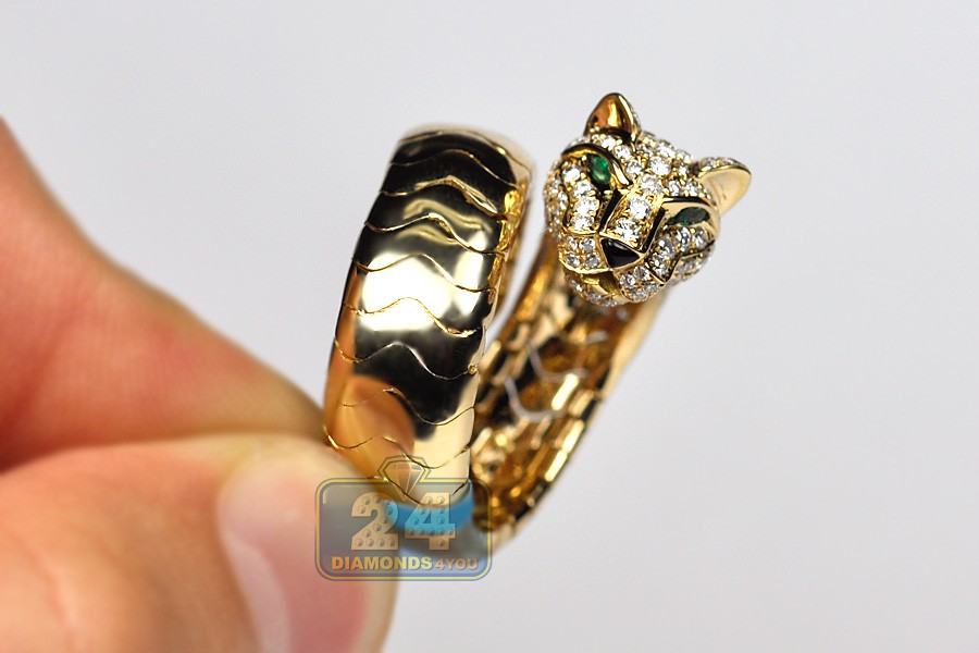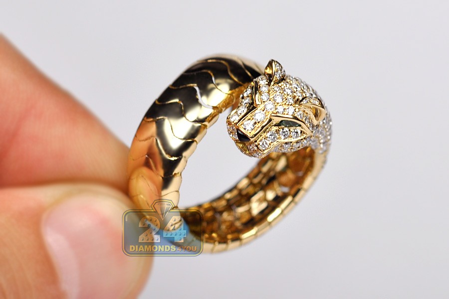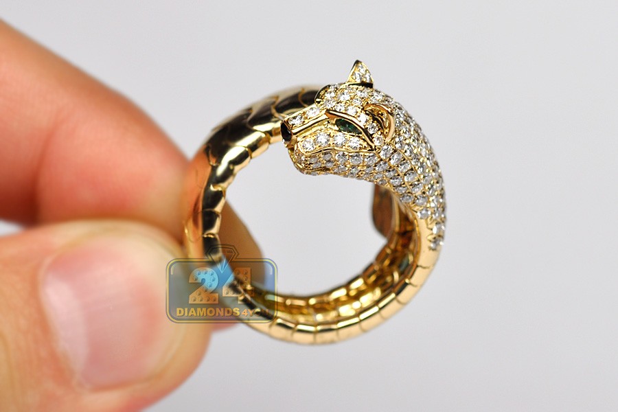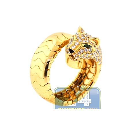 What a wild, wild cat! This detailed panther ring is skillfully designed to copy a realistic look and grace of the animal. It is masterly crafted in classic 18k yellow gold with perfectly polished finish, and skillfully accented with sparkling round cut diamonds weighting 1.63 carat. Genuine green emeralds are beautifully accenting the eyes. This diamond piece is the unique and extremely rare thing!