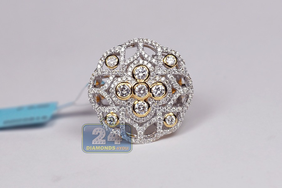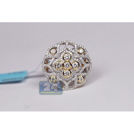 Our vintage inspired ring shines with royalty and sophistication! Amazingly round shaped with openwork elements, it is artfully designed in warming 18k yellow gold with shiny polish, and gorgeously handset with 1.73 carat of icy white round cut diamonds. The ring features nine larger sized brilliants that are expertly bezel set to add a special antique appearance. What a beautiful piece to add to your jewelry collection!