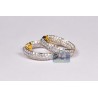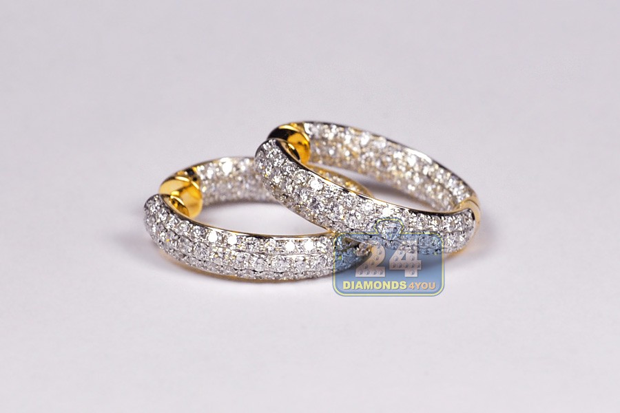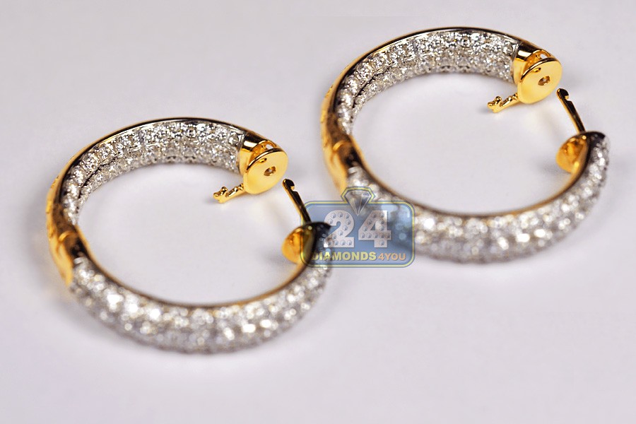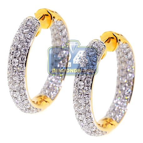 These diamond hoop earrings will light up any fancy event with marvelous shimmer! The pair is artfully produced from luxurious 18 karat yellow gold, and highly polished for extra sparkle. Our round hoops features 3.55 carats of icy white round brilliant-cut real diamonds, VS1-VS2 clarity, F-G color. They also measure 25 in dangling length and 5 mm in width. These lady's diamond hoop earrings are ready for the red carpet!