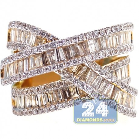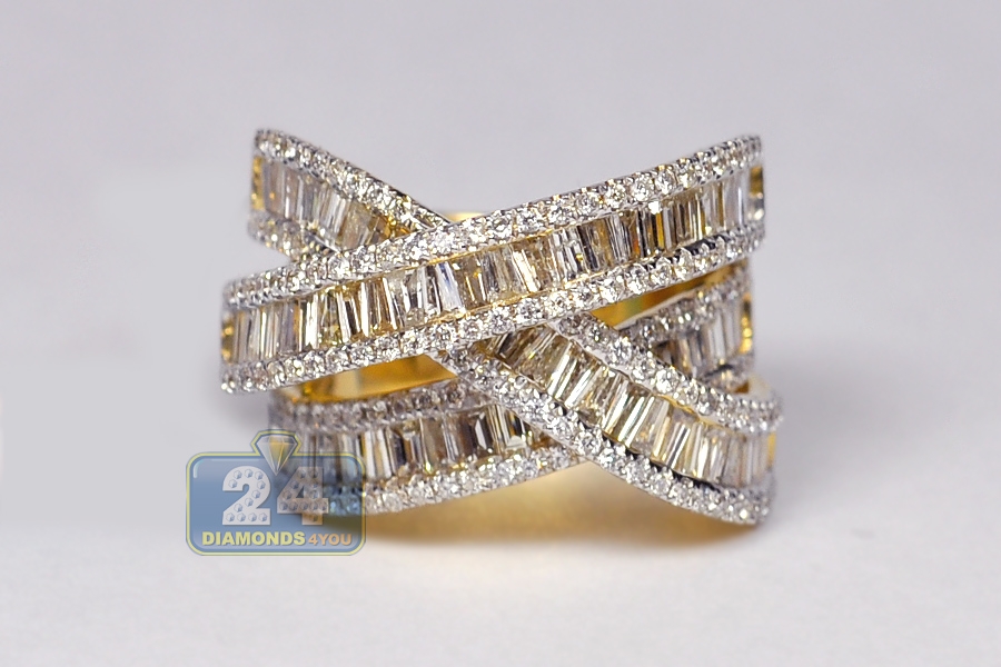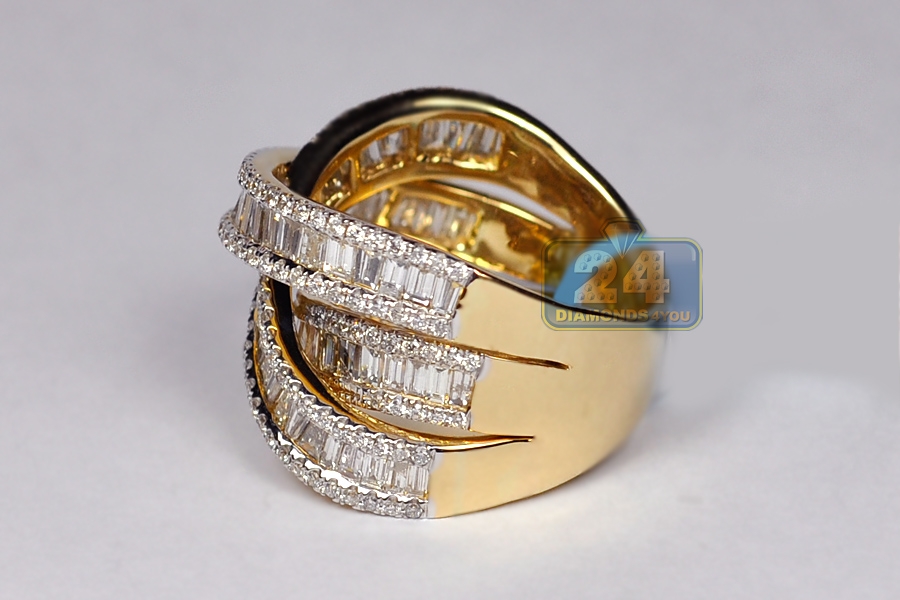 Be ready to get a lot of attention when you show up wearing our sparkling diamond highway ring! It is professionally produced from lustrous 18k yellow gold; and adorned with 3.93 carats of icy white baguette and round brilliant-cut diamonds. A glorious cistern of glamour!