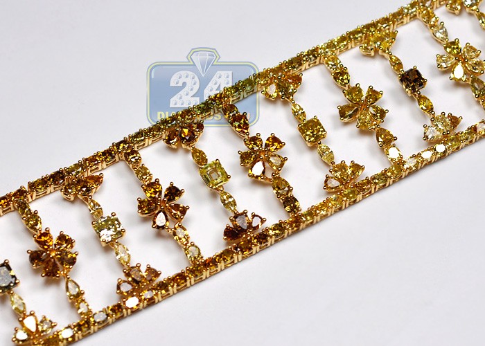 You are looking at one-of-a-kind fancy diamond piece! This bracelet has unique floral design featured a durable setting made of 18k yellow gold, and encrusted with 34.90 carats of natural fancy yellow multi-cut diamonds. The piece measures 7.5 inches in length and 30 mm in width. Make an unforgettable statement with this chick fancy diamond bracelet!