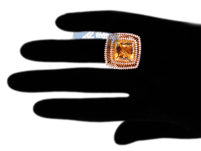 Dress yourself up with something spectacular! Handcrafted in warming 18k yellow gold with high polished finish, this cocktail ring features a genuine yellow citrine gemstone gorgeously placed in the center. Two rows of eye clean and sparkling round cut diamonds are beautifully accenting the center piece from the each side. Enjoy this gorgeous abstractly designed jewelry piece!
