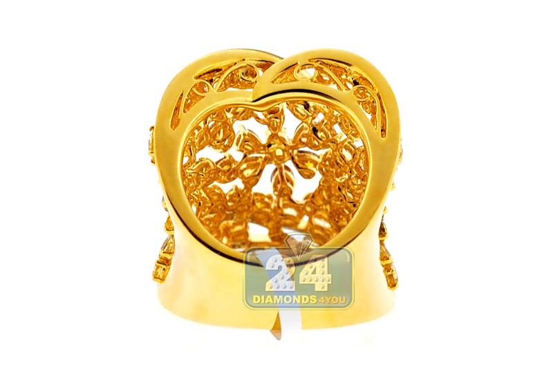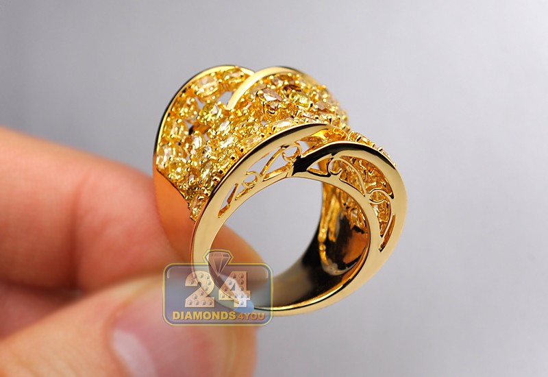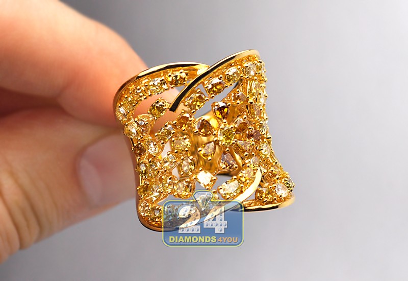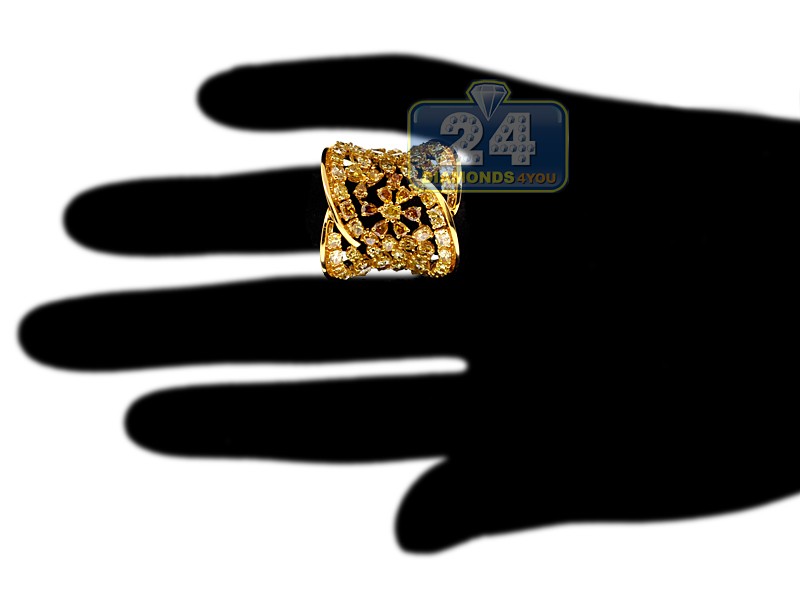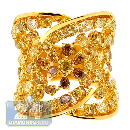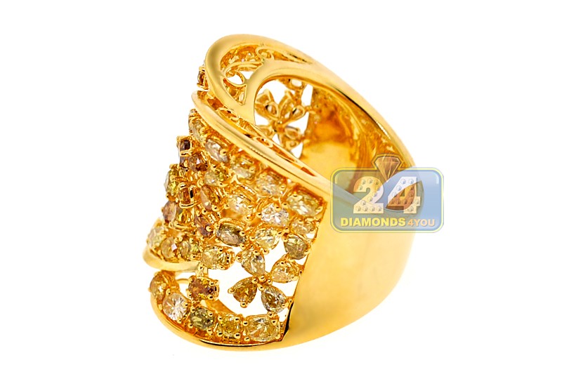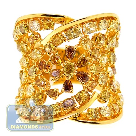 You are looking at one-of-a-kind fancy diamond jewelry piece! This ring has the unique floral inspired design and features a durable setting artfully handmade of warming 18k yellow gold with highly polished finish, and expertly encrusted with 5.63 carat of natural fancy multicolored diamonds of princess, oval and pear cut. Make an unforgettable statement with this chick band!