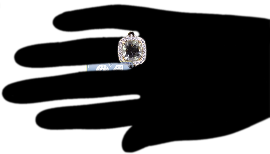 Our breathtaking amethyst diamond ring is destined for the red carpet! It is masterly handmade of warm 18k yellow gold; and encrusted with genuine cushion-cut green amethyst in the center (4.98 ct) and icy white round brilliant-cut diamonds on the sides (1.08 ct). A sumptuous display of luxury, quality and beauty that you will enjoy forever!