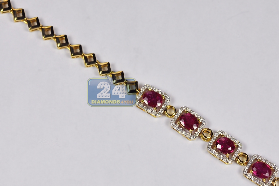 This eye-catching ruby diamond necklace makes a classy statement! It's beautifully created from solid 18k yellow gold, and highly polished for ultra shiny look. The links are amazed with 6.29 carats of oval-cut genuine rubies that haloed by 1.25 carat of gleaming white round brilliant-cut diamonds. Our women's gemstone necklace features 18 inches in length, central part of 40 x 6.5 mm and width of 4-6.5 mm. The piece of jewelry is closed by a very secure barrel clasp. How spectacular is this Y shape gemstone necklace!