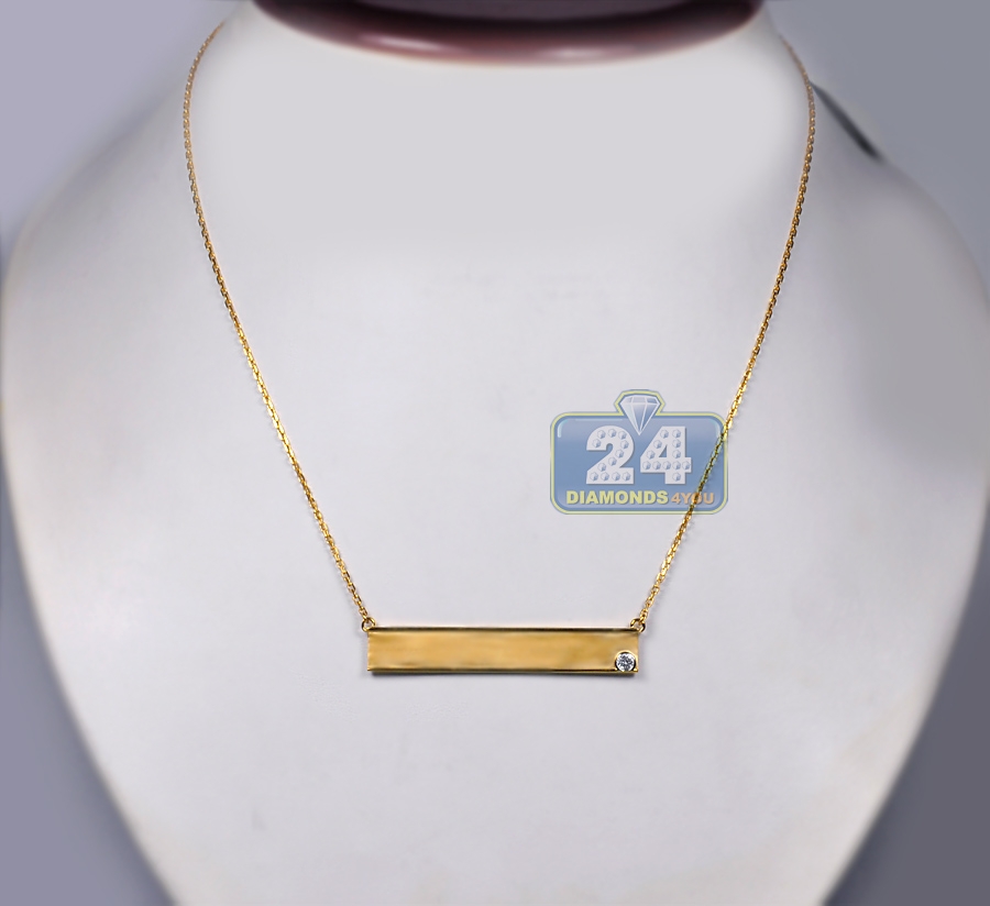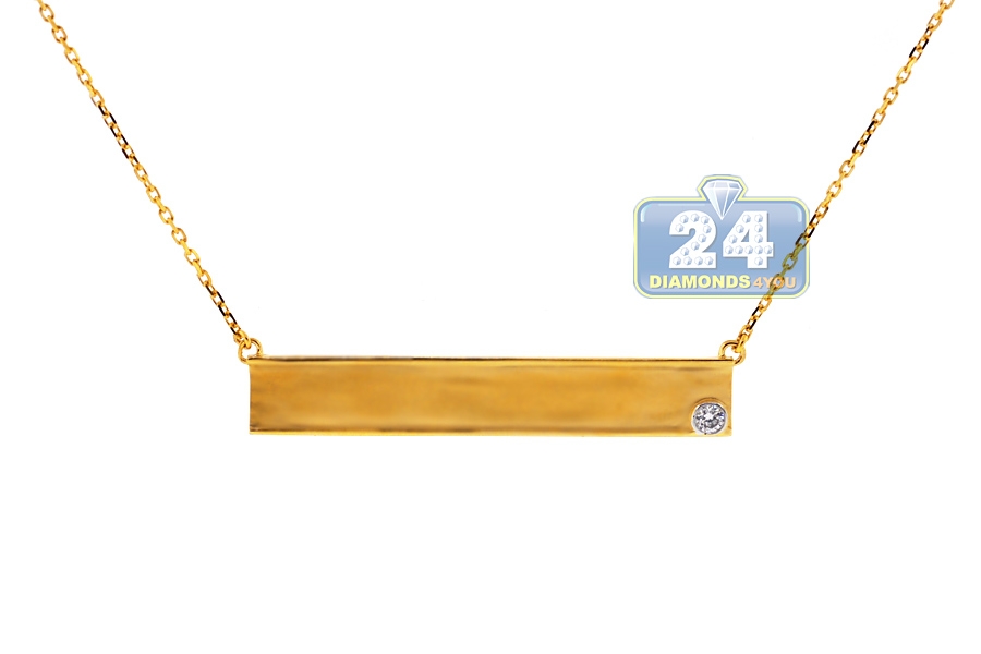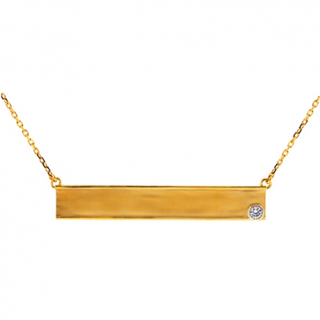 Ideal as a signature piece or a gift, our diamond ID name necklace can be beautifully engraved! Masterly created from luxurious 18k yellow gold, it is bezel-set with one icy white round brilliant-cut genuine diamond weighting 0.10 carat. The total length of women's diamond necklace is 18 inches that secured by a safe lobster claw clasp. The name can be engraved on the plate of 50 x 8 mm. See your name in lights!