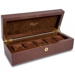 High-quality craftsmanship and stylish design are combined in this five watch brown storage box L263, a member of Portman series produced by Rapport London. The unit is designed to keep up to 5 watches in tact and place. It features fine brown leather embossed in crocodile pattern exterior, and matching brown velveteen interior. There are five removable padded adjustable pillows to hold the pieces of any case diameters. It measures 360 mm in width, 140 mm in depth and 90 mm in height. The travel case can be securely locked with a supplied key. We are an official dealer of the brand. So you get factory warranty and free domestic shipping for this item.