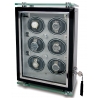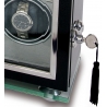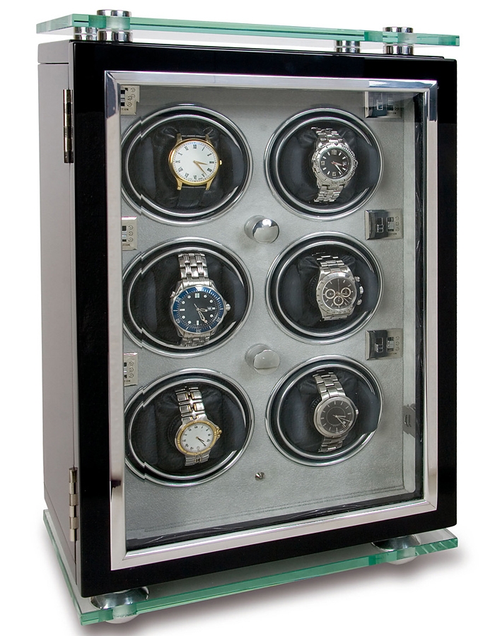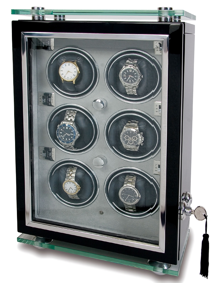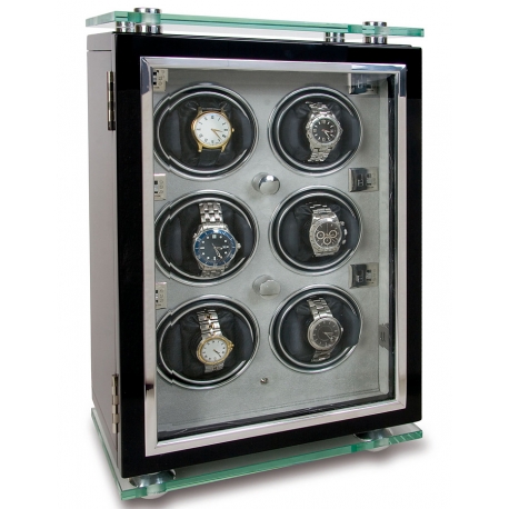 Looking for user-friendly leading technology, stylish design and exquisite craftsmanship? Check this six automatic watch winder cabinet W266, a part of Optima collection manufactured by Rapport London. Its case is ably created from solid ebony wood with high-gloss lacquered finish, and accented with chrome plated brass hardware. There're also thick glass panels on the top and bottom of the box. It's fitted with hinged lockable glass door with aluminum accents. The interior is lined with soft gray velveteen, and illuminated with bright LED light. Each of 6 watch cups is covered with black leather, and has adjustable soft clip that accommodates any length of watch band. Motors run virtually silent offering various winding programs including 2 speed rotation options (1130-1690 or 3960 turns per day) as well as 3 direction rotation modes (clockwise, counter-clockwise or bi-directional). The device is powered by AC adapter, and has an optional battery slot. It measures 19.5 inches in height, 11.8 inches in width and 6.3 inches in depth. Be sure that advanced programmability of this drive system will ideally wind any self-winding timepiece! We're an official dealer of the brand. So you get factory warranty and free domestic shipping for this item.