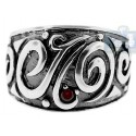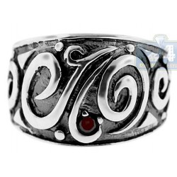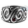 Elegant and sophisticated, this substantial women's band will add a vintage vibe to your daily look! It is skillfully handmade of oxidized 925 Sterling Silver and showcases a small red cz crystal of round cut as well as antique inspired pattern all over the piece.