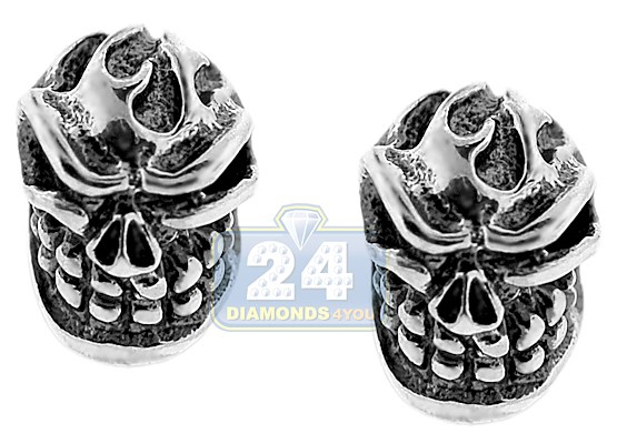 Enhance your style with these fun skull sterling silver stud earrings. This jewelry piece is made of oxidized sterling silver. A lot of beautiful jewelry is produced from the oxidized sterling silver these days which is unique in color and look. The exotic ornaments made of this kind of silver will marvel you. The oxidized silver is darker and its finish is less sparkling. The silver gets a smoky look after it has gone through the chemical treatment.