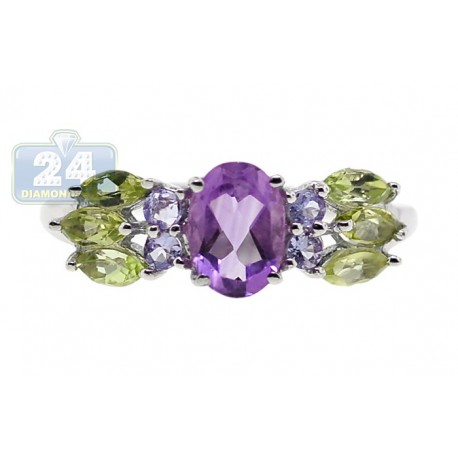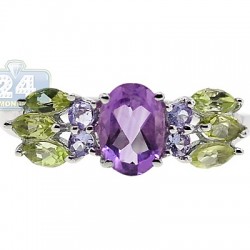 This cute ring is a gorgeous mix of colors and natural gems! It is skillfully handcrafted in lustrous 925 sterling silver with perfectly polished shiny finish, and artfully encrusted with oval shaped purple amethyst, marquises cut green peridot and blue tanzanite of round cut. The ring carries a total gemstone weight of approximately 1.55 carat. No doubt, this jewelry piece will add an extra touch of glamour to your look!