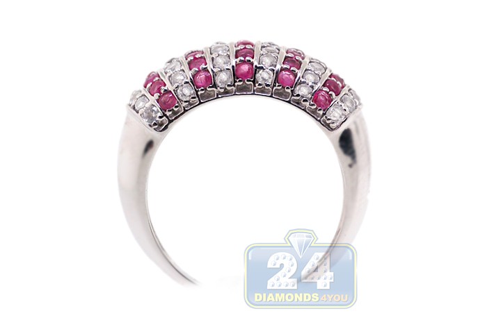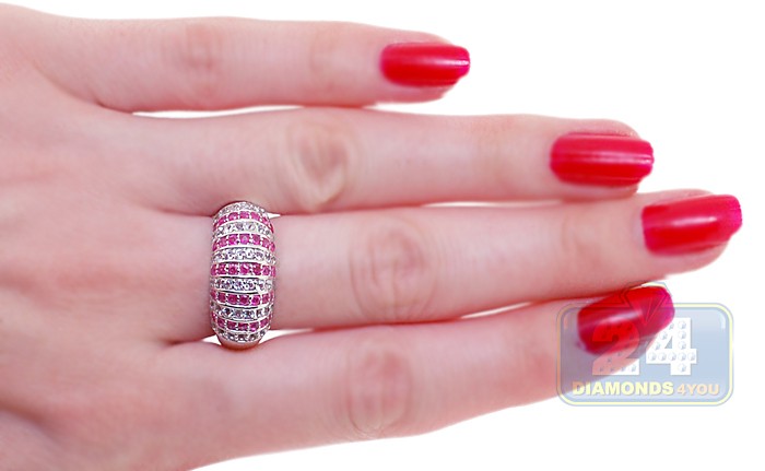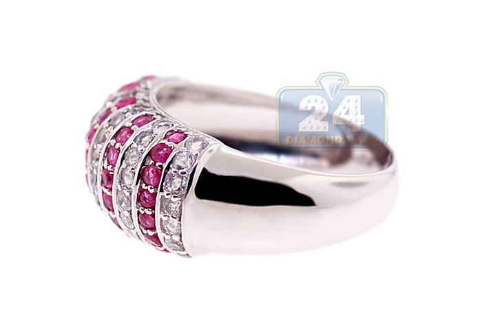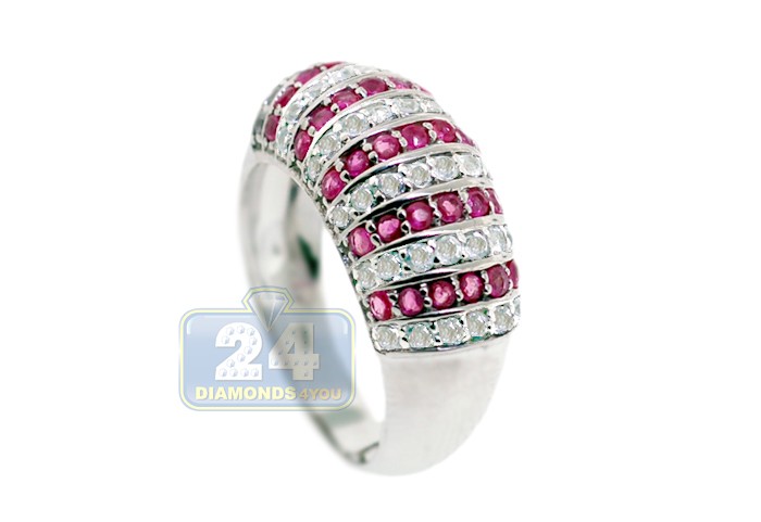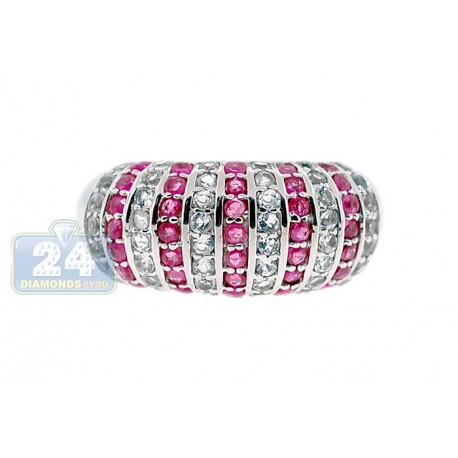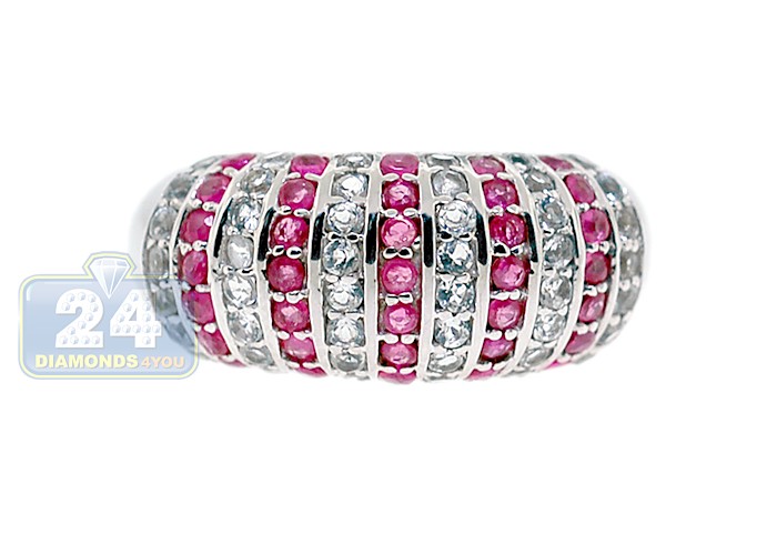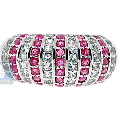 Beauty, quality and affordable price go together so amazingly in this dome styled mixed gem ring! Arranged in alternate rows round cut shining white topaz and lovely red rubies lend a lively, festive look to this 925 sterling silver ring. It features a total gemstone weight of 2.43 carat. Add a contemporary splash to your jewelry collection with such a gorgeous jewelry piece!