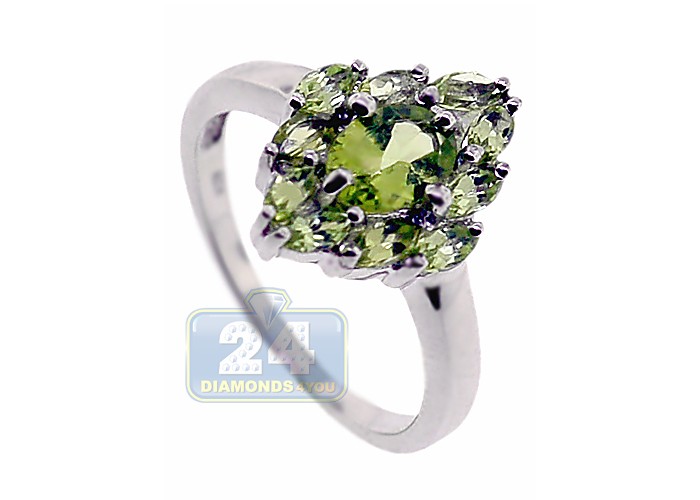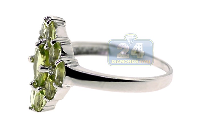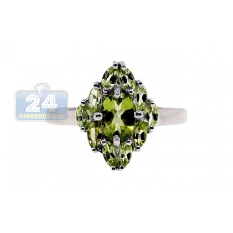 Let's go completely green! Our nature inspired women's ring simply beautiful! It is professionally crafted in cool 925 Sterling Silver, has highly polished shiny finish, and features a cluster of genuine vibrant green peridots weighting approximately 2.95 carat. These gemstones are presented in two shapes: oval and marquise. Simply stunning jewelry piece to match your summerish dress!
