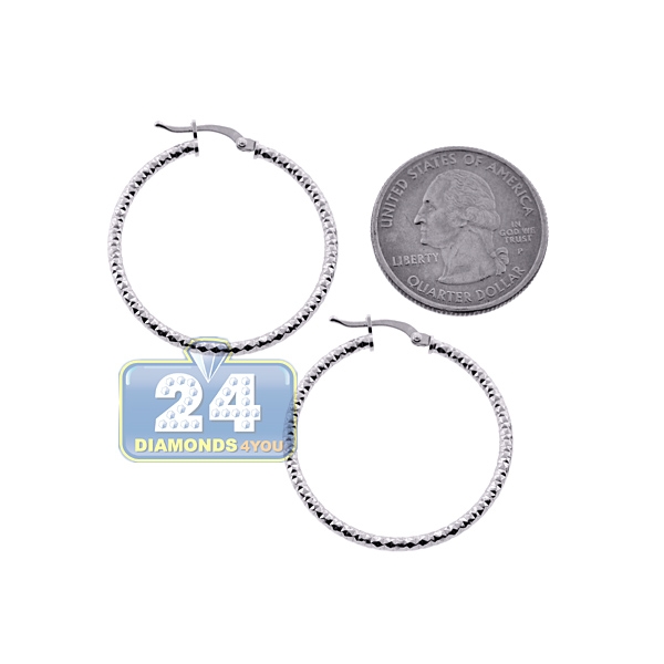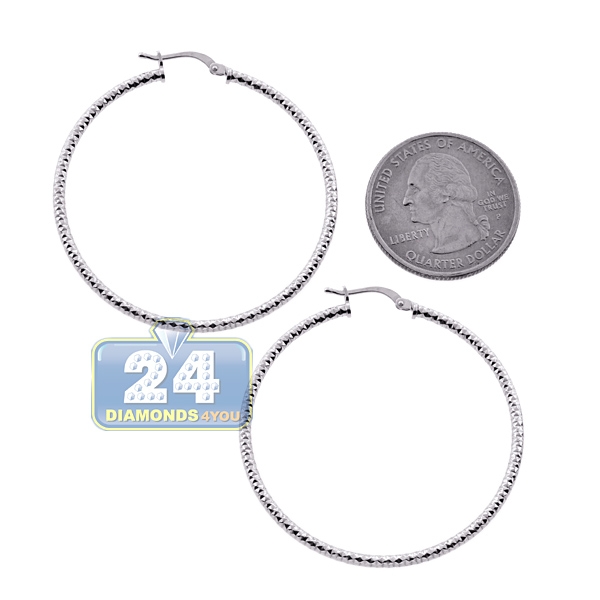 Here is one spectacular pair of round hoops! They are expertly made of precious 925 sterling silver, and covered with white rhodium that helps prevent tarnishing and gives a bright color. The earrings also feature diamond-cut design for extra sparkle, measure 2 mm in width, and secure with a safe post clasp. You may find the perfect size such as 0.75 inches, 1 inch, 1.25 inches, 1.5 inches, 1.75 inches, 2 inches, 2.275 inches, 2.6 inches or 3 inches. These gorgeous hoop earrings are just perfect for your next special event!