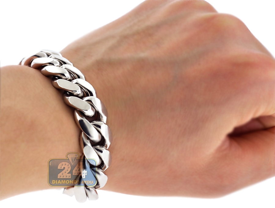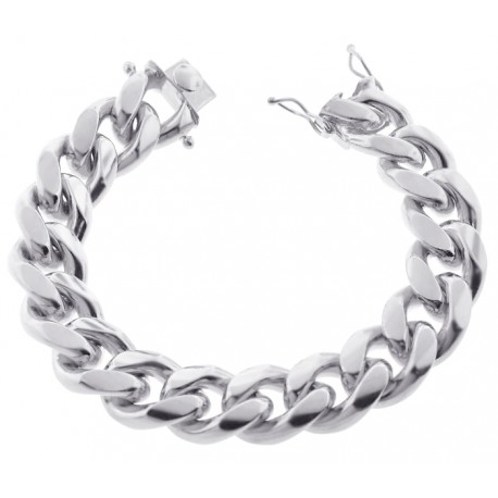 Featuring 18 mm in width, 9 inches in length and approximately 189 grams in weight, our solid miami cuban bracelet makes a bold statement! It's masterly handcrafted in precious 925 sterling silver, and covered with white rhodium that helps prevent tarnishing and gives a bright color. Enjoy wearing this handsome cuban link bracelet!