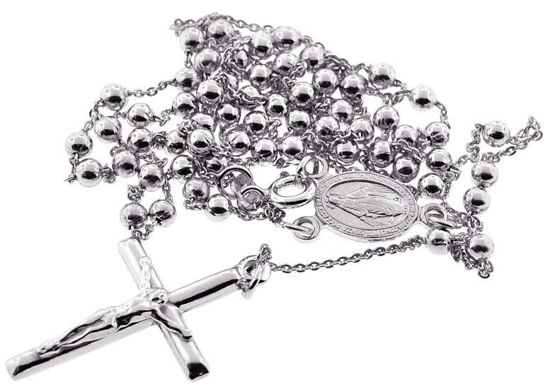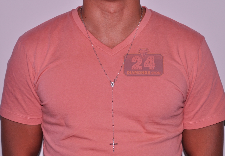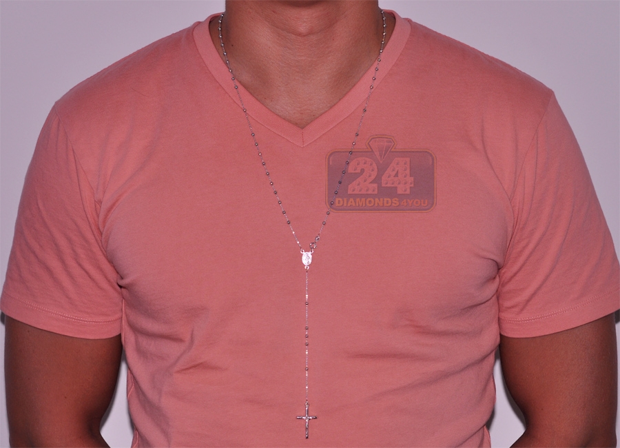 Make a beautiful statement of faith and fashion with our rosary bead necklace! It is expertly created from cool 925 sterling silver in Italy, and covered with white rhodium that helps prevent tarnishing and gives a bright white color. This religious cross necklace will perfectly suit both men and women. Its beads have width of 3 mm, and available in length of 24 or 26 inches (excluding a dangling part which measures 5.5 inches in length). This sterling silver rosary beads is a timeless accessory that looks unique anytime!