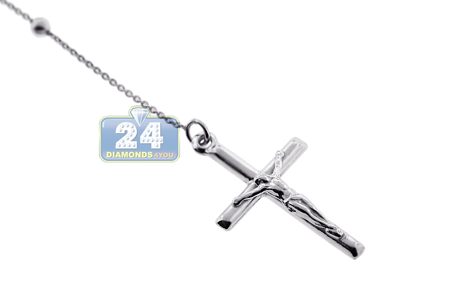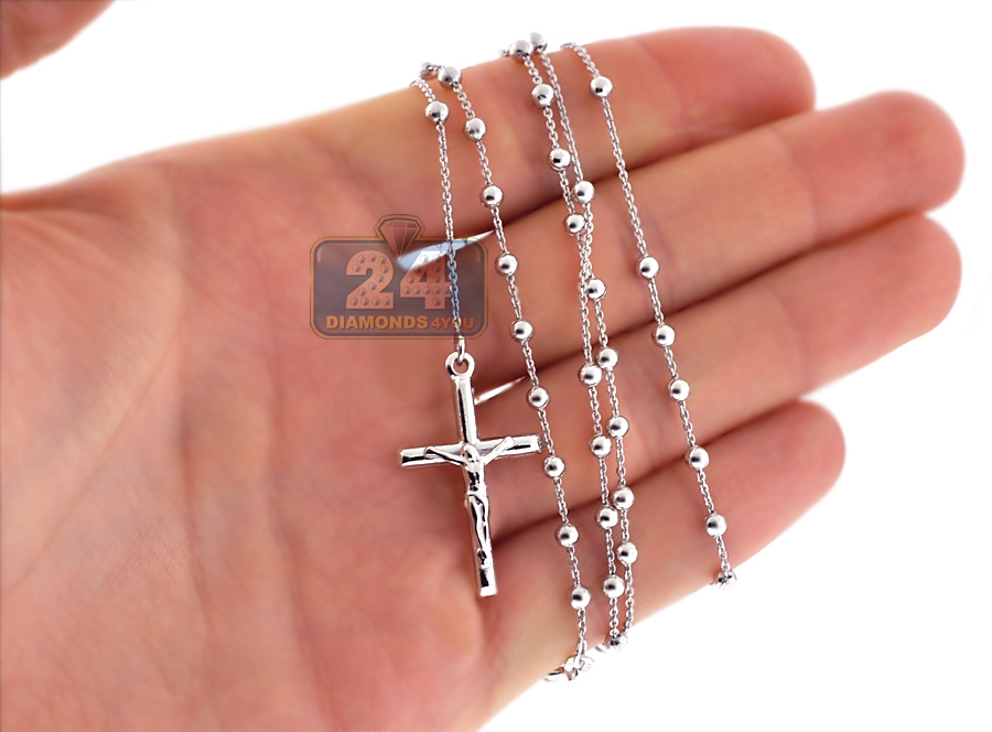 Sterling Silver Religious Rosary Bead Cross Necklace 3 mm