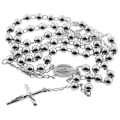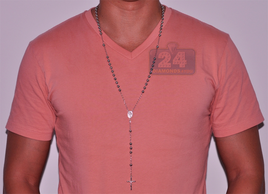 Express your captivating confidence with our spiritually sensational rosary necklace! It is professionally created from lustrous 925 sterling silver, and covered with white rhodium that helps prevent tarnishing and gives a bright color. The piece of jewelry measures 28 inches in length (not including a dangling part) and 6 mm beads. This religious necklace is a timeless accessory that looks unique anytime!