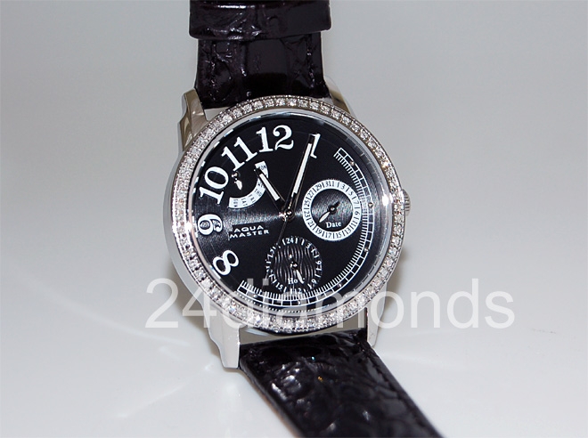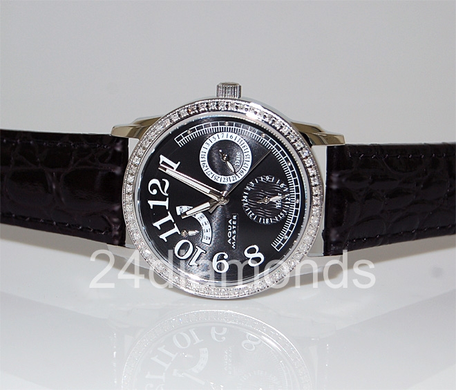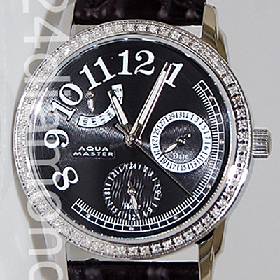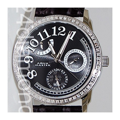 One-Row Diamond Bezel with approx. 0.50 ct White Diamonds, Black Galouche Dial Classically Designed Chronograph showing Hour , Day & Date , Printed Aqua Master Logo on a Dial, Round 34mm Solid Stainless Steel Case, Matching Genuine Leather Band, High Quality Japan Movement, Water Resistant.