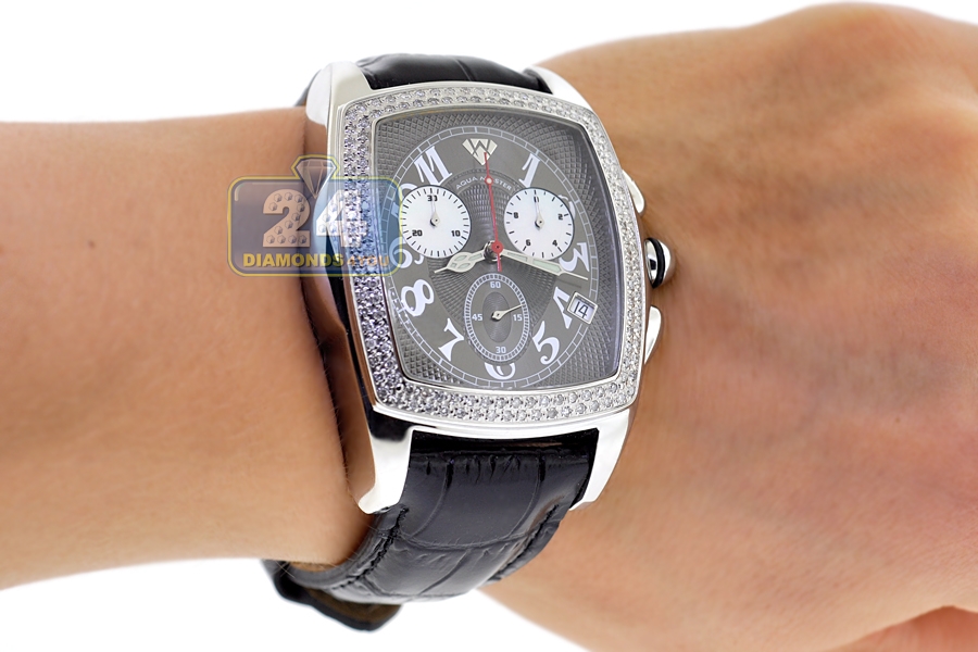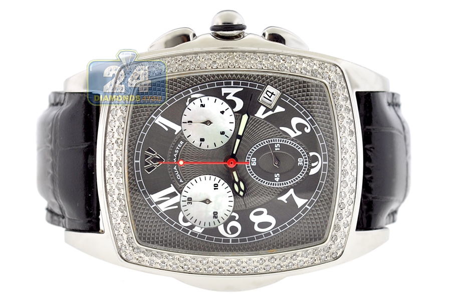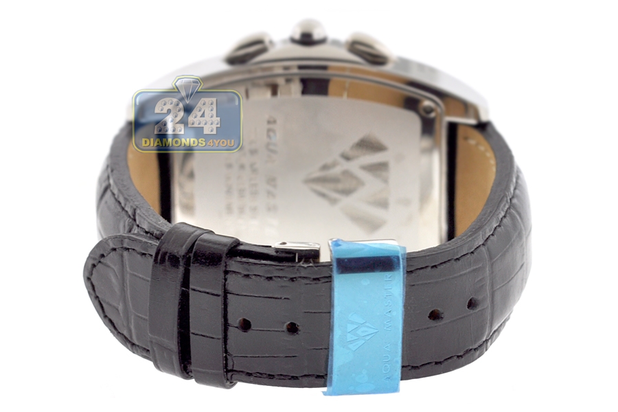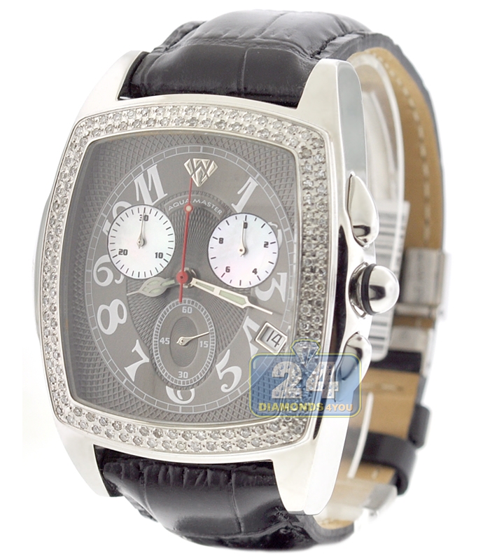 Reference code 72921460737 - Be ready for a night out with this glittering diamond watch for men designed by Aqua Master. It features durable square-shaped stainless steel case that encrusted with two rows of genuine white diamonds totaling 1.50 carat. The timepiece also has gray dial with three sub-dials, and genuine black leather strap. For accurate timing, it is equipped with reliable Swiss quartz movement that has chronograph and date functions. As official dealer of Aqua Master brand, 24diamonds.com offers original packaging, 1-year factory warranty and professional after-warranty service.