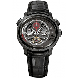 This Audemars Piguet Millenary Carbon One Watch 26152AU.OO.D002CR.01 is a magnificent piece. Case is masterly created from light-weight but very hard forged carbon fibers. Bezel, crown and pushers are made of black ceramic. Case back is produced from black PVD titanium. The timepiece features hand-wound mechanical movement (caliber 2884; 21,600 vph; 30 jewels; 336 parts) with incredible power reserve of 290 hours. This indicator is located between 7 and 10 o'clock positions. 30-minute counter sub-dial is located at 12 o'clock. There is also amazing tourbillon at the 9 o'clock. This is limited and numbered edition of 120 pieces.