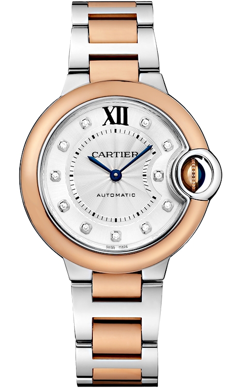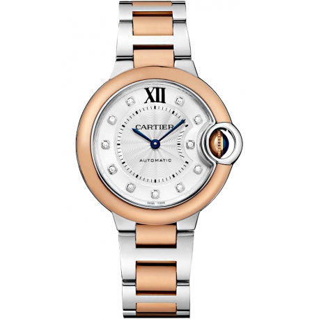 Ballon Bleu de Cartier 33 mm Automatic Diamond Silver Dial 18K Pink Gold Steel Bracelet Women's Watch - Reference W3BB0006