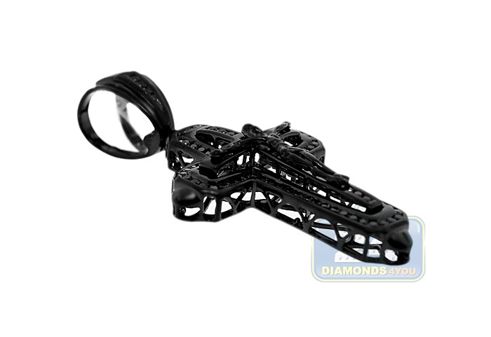 Our crucifix cross pendant is a classic but unique symbol of hope and faith! It's ably manufactured from solid 14 karat white gold, and features long-lasting black rhodium finish. The cross pendant is channel set with mysterious black round-cut natural diamonds of 1.02 carat. This men's religious pendant measures 59 mm in dangling length, and cross itself is 45 x 31 mm. The diamond spiritual pendant will make a mysterious addition to any believer's collection!