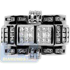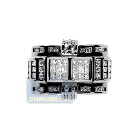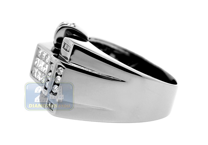 Our unique 14k gold ring is so handsome & mysterious! It features unusual design that is a real eye catcher! Two stunning squares in the middle are invisibly handset with sparkling princess cut diamonds, and gorgeously surrounded by dazzling round shape brilliants. Each stone features SI1-SI2 clarity with G-H color. The black rhodium accent is a spectacular finishing touch to this men's accessory.