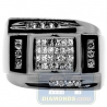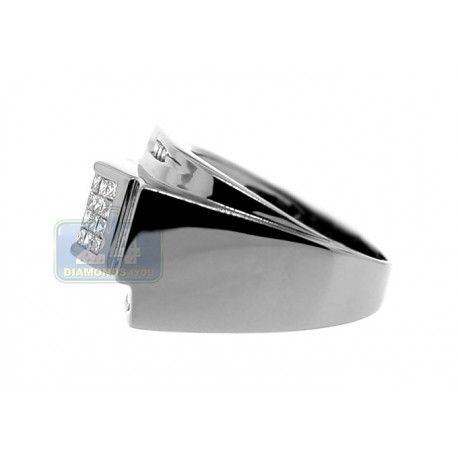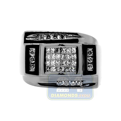 Truly unique and sophisticated, this 14k white gold ring features black rhodium finish giving it absolutely distinctive look and feel! The shimmering center piece is handset with breathtaking white princess cut diamonds that are set invisibly. Two horizontal and vertical lines of striking round shaped stones are designed to give the piece totally fancy and masculine effect!