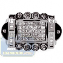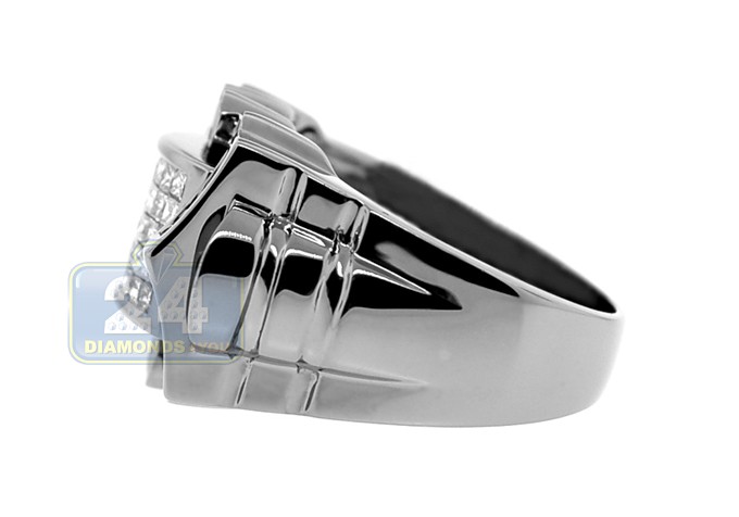 Our men's ring is so sharp and handsome! Three different shapes of diamonds are used to achieve such a sophisticated look! Natural invisible set princess diamonds sparkle in the center and adorned by vertically placed baguettes as well as horizontally handset round brilliants. Cool 14k white gold setting is professionally finished off in black pvd coating to achieve that mysterious look!