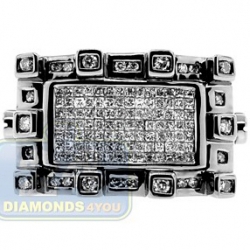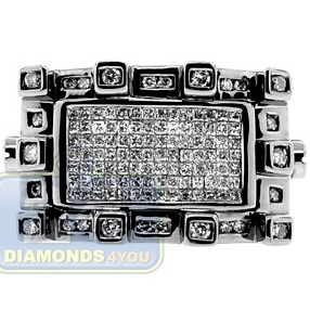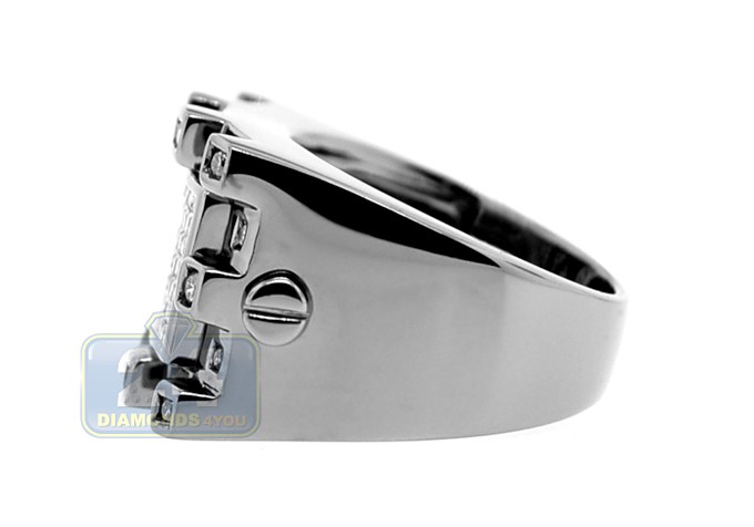 Feel confident and stylish while wearing this rich looking men's ring! Black pvd covered 14k white gold setting features a masculine center piece invisibly set with bright princess cut diamonds. Originally designed rectangle borders of the ring are masterly accented with shimmering round cut diamonds. All brilliants used are high quality, with G-H color and SI1-SI2 clarity. Two custom bolts are handsomely placed on both sides of the setting adding a special accent to this jewel.