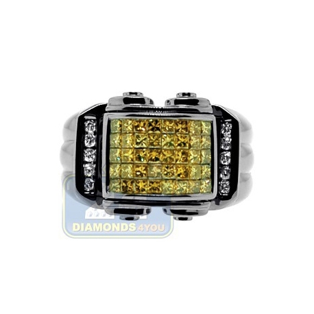 Stunning combination of white (0.24 ct total weight) round cut & yellow (1.10 ct total weight) princess cut invisible set diamonds gives this ring a visually impressive character! The piece is skillfully handmade of 14k white gold with black rhodium finish to add some mystery and sophistication.
