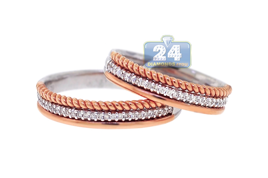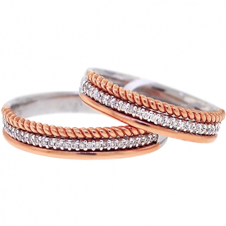 Our original diamond set of his and her wedding bands symbolized lifelong promise! Artfully handcrafted in 18k gold of white and rose colors, they're amazed with 0.28 carat of icy white round brilliant-cut diamonds. These gorgeous bridal rings will be favorite pieces for years to come!