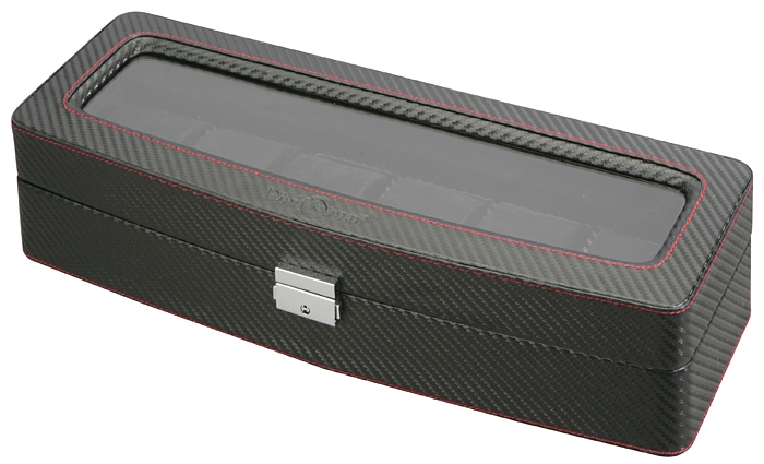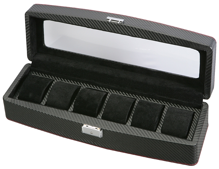 This Diplomat 31-447 six watch and jewelry storage case is specifically designed to keep your most prized possessions in a safe and luxurious place. The case is capable of holding 6 watches. The outside of this case is lined with a carbon fiber pattern material and features bold red stitching around the corners. It also has a see through top making this case perfect for displaying your beautiful watches. The interior is made of ultra soft black suede, so you can rest assured that your possessions will not get ruined. Whether you display it as a beautiful piece of furniture or simply take it on the go, this is the perfect watch case for you.