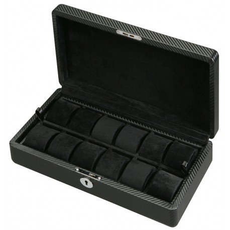 This Diplomat 31-448 twelve watch and jewelry storage case is specifically designed to keep your most prized possessions in a safe and luxurious place. The case is capable of holding 12 watches. The watch tray inside is completely removable so you can remove the tray and use this case as a jewelry chest. The outside of this case is lined with a carbon fiber pattern material. It also has a see through top making this case perfect for displaying your beautiful watches. The interior is made of ultra soft black suede, so you can rest assured that your possessions will not get ruined. Whether you display it as a beautiful piece of furniture or simply take it on the go, this is the perfect watch case for you.