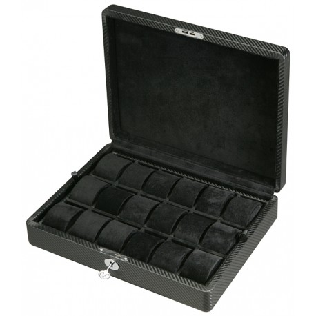 This Diplomat 31-445 eighteen watch and jewelry storage case is specifically designed to keep your most prized possessions in a safe and luxurious place. The case is capable of holding 18 watches. The watch tray is completely removable so this box can also be used as a simple jewelry chest as well. The outside of this case is lined with a carbon fiber pattern material. The interior is made of ultra soft black suede, so you can rest assured that your possessions will not get ruined. Whether you display it as a beautiful piece of furniture or simply take it on the go, this is the perfect watch case for you.
