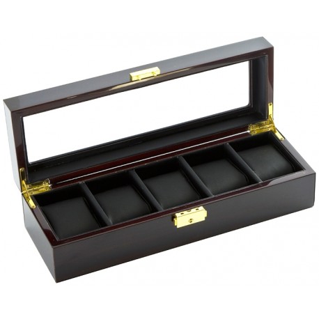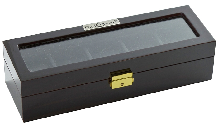 Display your timepieces in this Diplomat 31-57501 five watch case chest. This handcrafted ebony wood finish chest will hold a total of 5 of your finest watches. The interior is lined with plush black leatherette and each compartment comes with a removable cushion. This chest has 5 watch compartments with holders. The lid is inlaid with a Lucite window for viewing your timepieces and is attached by two brass hinges. This Diplomat luxurious chest is a safe and secure way to display your most valuable timepieces.