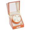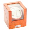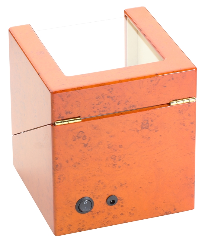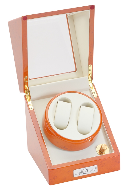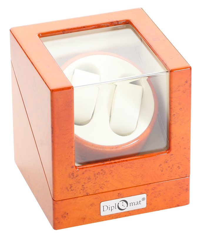 You are looking at an affordable Diplomat Estate 31-411 double watch winder in burl wood. The device is powered by a very silent Japanese Mabuchi motor that features four programmed settings (650, 900, 1350, or 1800 TPD) which prevents the winder from over-winding or straining the internal mechanisms of the watch. The four programmed timer settings are: (1) The turntable will rotate clockwise for one minute, then rest of 20 minutes, then repeat; which provides a total of 650 TPD; (2) The turntable will rotate counter-clockwise for two minutes, then rest of 28 minutes, then repeat; which provides a total of 900 TPD; (3) The turntable will rotate counter-clockwise for 3 minutes then rest for 27 minutes, then the turntable will rotate clockwise for 3 minutes then rest for 27 minutes, then repeat; which provides a total of 1350 TPD; (4) The turntable will rotate clockwise for 10 minutes then rotate counter-clockwise for 10 minutes (this will repeat for 1 hour), then rest for seven hours, then repeat; which provides a total of 1800 TPD.