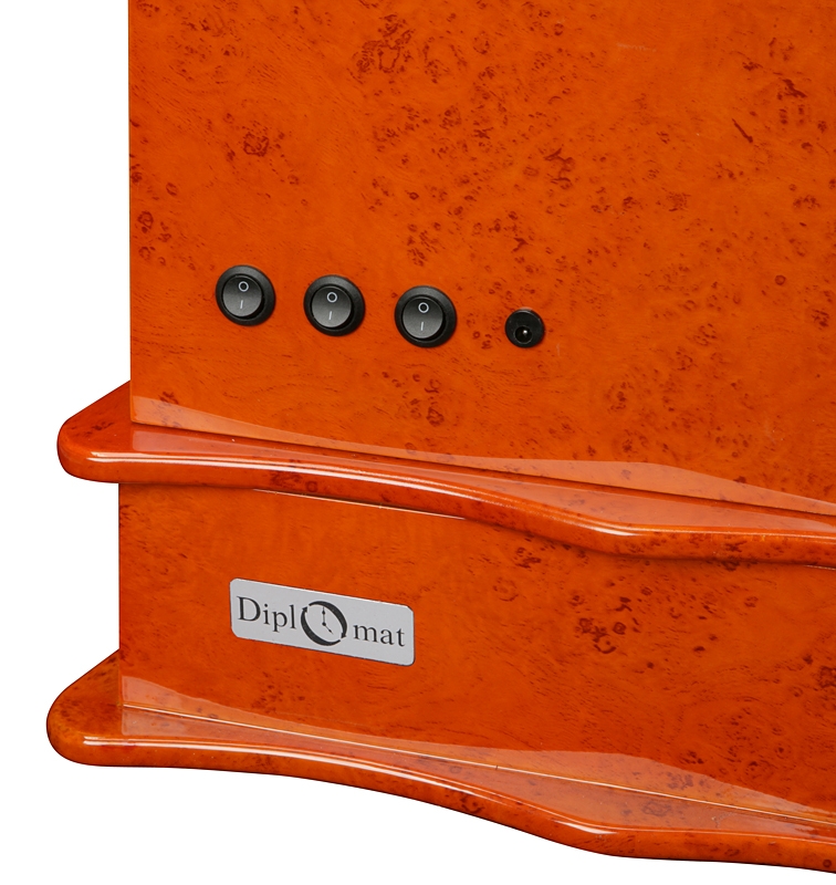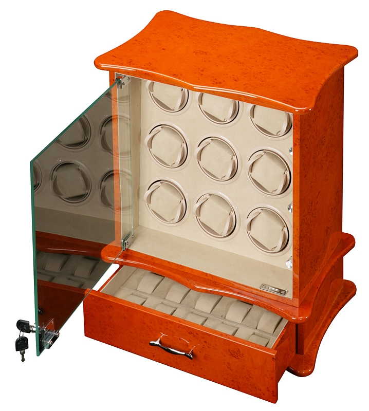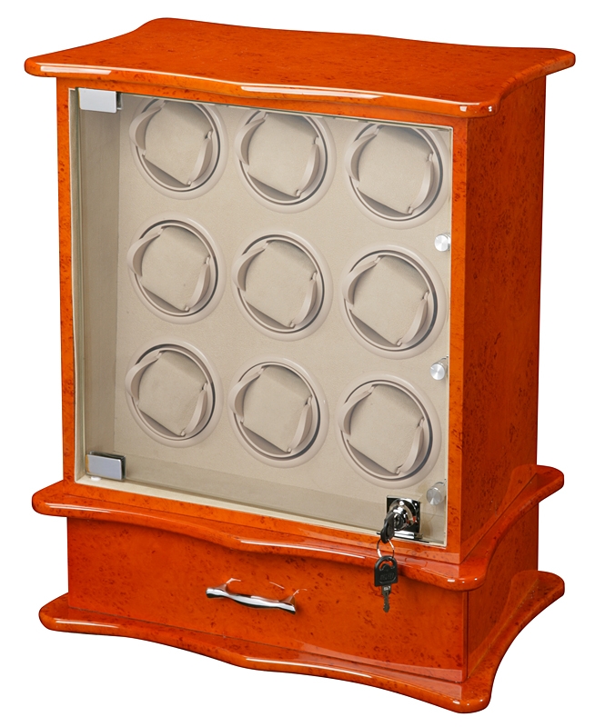 This Diplomat Estate 31-421 burl nine watch winder cabinet has additional storage for 10 watches, and will make your favorite timepieces ready to wear anytime. It is powered by a very silent Japanese Mabuchi motor that features four programmed settings (650, 900, 1350, or 1800 TPD) which prevents the winder from over-winding or straining the internal mechanisms of the watch. The four programmed timer settings are: (1) The turntable will rotate clockwise for one minute, then rest of 20 minutes, then repeat; which provides a total of 650 TPD; (2) The turntable will rotate counter-clockwise for two minutes, then rest of 28 minutes, then repeat; which provides a total of 900 TPD; (3) The turntable will rotate counter-clockwise for 3 minutes then rest for 27 minutes, then the turntable will rotate clockwise for 3 minutes then rest for 27 minutes, then repeat; which provides a total of 1350 TPD; (4) The turntable will rotate clockwise for 10 minutes then rotate counter-clockwise for 10 minutes (this will repeat for 1 hour), then rest for seven hours, then repeat; which provides a total of 1800 TPD.