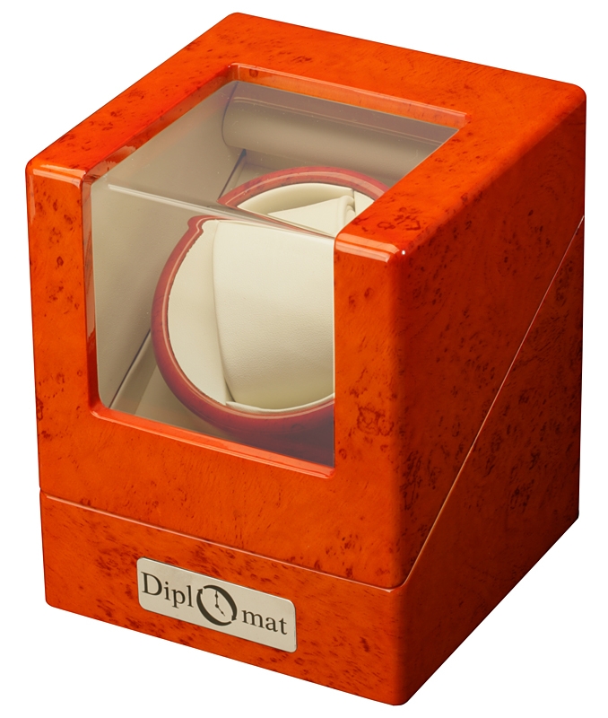 This Diplomat Estate 31-406 burl single watch winder will make your favorite watch ready to wear anytime. It is powered by a very silent Japanese Mabuchi motor that features four programmed settings (650, 900, 1350, or 1800 TPD) which prevents the winder from over-winding or straining the internal mechanisms of the watch. The four programmed timer settings are: (1) The turntable will rotate clockwise for one minute, then rest of 20 minutes, then repeat; which provides a total of 650 TPD; (2) The turntable will rotate counter-clockwise for two minutes, then rest of 28 minutes, then repeat; which provides a total of 900 TPD; (3) The turntable will rotate counter-clockwise for 3 minutes then rest for 27 minutes, then the turntable will rotate clockwise for 3 minutes then rest for 27 minutes, then repeat; which provides a total of 1350 TPD; (4) The turntable will rotate clockwise for 10 minutes then rotate counter-clockwise for 10 minutes (this will repeat for 1 hour), then rest for seven hours, then repeat; which provides a total of 1800 TPD.