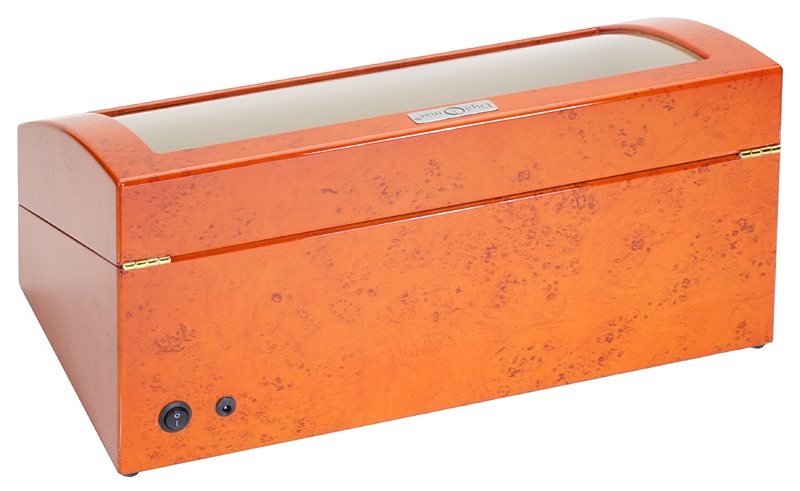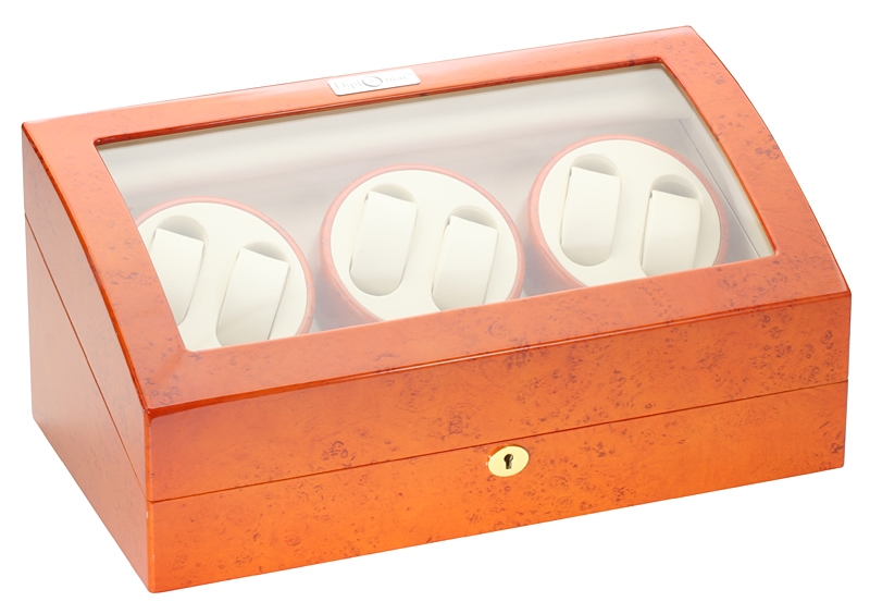 This Diplomat Estate 31-417 burl six watch winder has additional storage for 7 watches, and will make your favorite timepieces ready to wear anytime. It is powered by a very silent Japanese Mabuchi motor that features four programmed settings (650, 900, 1350, or 1800 TPD) which prevents the winder from over-winding or straining the internal mechanisms of the watch. The four programmed timer settings are: (1) The turntable will rotate clockwise for one minute, then rest of 20 minutes, then repeat; which provides a total of 650 TPD; (2) The turntable will rotate counter-clockwise for two minutes, then rest of 28 minutes, then repeat; which provides a total of 900 TPD; (3) The turntable will rotate counter-clockwise for 3 minutes then rest for 27 minutes, then the turntable will rotate clockwise for 3 minutes then rest for 27 minutes, then repeat; which provides a total of 1350 TPD; (4) The turntable will rotate clockwise for 10 minutes then rotate counter-clockwise for 10 minutes (this will repeat for 1 hour), then rest for seven hours, then repeat; which provides a total of 1800 TPD.