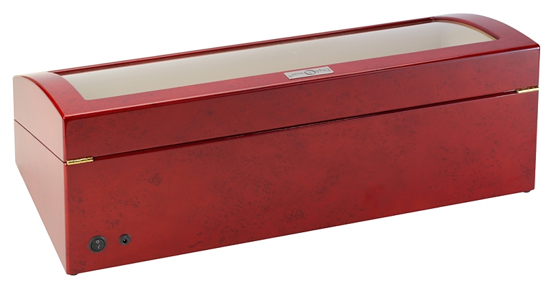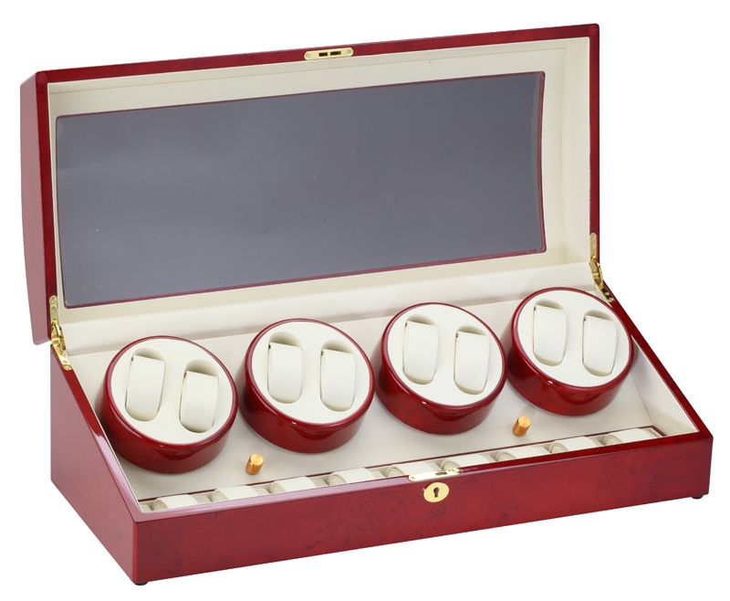 This Diplomat Estate 31-418 cherry eight watch winder has additional storage for 9 watches, and will make your favorite timepieces ready to wear anytime. It is powered by a very silent Japanese Mabuchi motor that features four programmed settings (650, 900, 1350, or 1800 TPD) which prevents the winder from over-winding or straining the internal mechanisms of the watch. The four programmed timer settings are: (1) The turntable will rotate clockwise for one minute, then rest of 20 minutes, then repeat; which provides a total of 650 TPD; (2) The turntable will rotate counter-clockwise for two minutes, then rest of 28 minutes, then repeat; which provides a total of 900 TPD; (3) The turntable will rotate counter-clockwise for 3 minutes then rest for 27 minutes, then the turntable will rotate clockwise for 3 minutes then rest for 27 minutes, then repeat; which provides a total of 1350 TPD; (4) The turntable will rotate clockwise for 10 minutes then rotate counter-clockwise for 10 minutes (this will repeat for 1 hour), then rest for seven hours, then repeat; which provides a total of 1800 TPD.