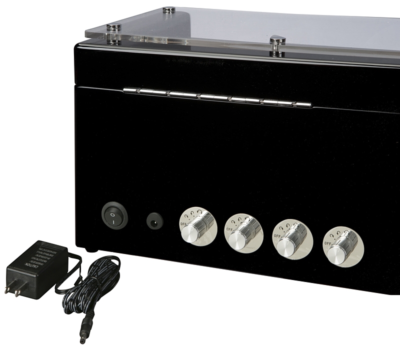 This Diplomat Gothica 31-478 black eight watch winder will make your favorite timepieces ready to wear anytime. It is powered by a very silent Japanese Mabuchi motor that features four programmed settings (650, 900, 1350, or 1800 TPD) which prevents the winder from over-winding or straining the internal mechanisms of the watch. The four programmed timer settings are: (1) The turntable will rotate clockwise for one minute, then rest of 20 minutes, then repeat; which provides a total of 650 TPD; (2) The turntable will rotate counter-clockwise for two minutes, then rest of 28 minutes, then repeat; which provides a total of 900 TPD; (3) The turntable will rotate counter-clockwise for 3 minutes then rest for 27 minutes, then the turntable will rotate clockwise for 3 minutes then rest for 27 minutes, then repeat; which provides a total of 1350 TPD; (4) The turntable will rotate clockwise for 10 minutes then rotate counter-clockwise for 10 minutes (this will repeat for 1 hour), then rest for seven hours, then repeat; which provides a total of 1800 TPD.
